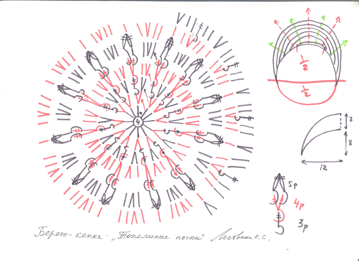 Вяжите берет по схеме плоского круга из столбиков с накидом по спирали. Прибавки в двенадцати местах делайте до диаметра 25 - 26 см. Без прибавок провяжите ровную часть - 4 - 5 см. Далее вяжите с убавками в двенадцати местах до размера ОГ. Заканчивайте вязание берета бортиком из столбиков без накида на высоту 2 - 3 см. Обвяжите "рачьим шагом". Если хотите сделать козырёк, то на бортике не вяжите последний ряд. Сделайте выкройку козырька - как часть полей на половине окружности головы. От края козырька проведите параллельные линии, приблизительно на высоту ряда из столбиков без накида. Эти линии определят длину первого короткого ряда.