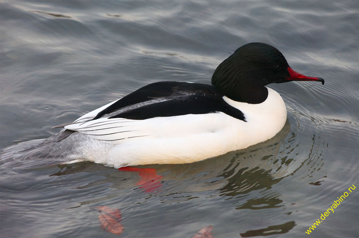 Самый крупный крохаль. 🔍 ВНЕШНИЙ ВИД 👦 Самец: В брачном наряде имеет контрастную окраску с розовым оттенком на нижней стороне. Преимущественно белый. С черными головой, верхом шеи и спиной. Голова кажется больше из-за короткого, прижатого к ней хохла. Красный клюв с большим темным крючком заметно утолщен у основания. 👧 Самка: Светло-серая. С резкими границами рыже-каштанового и белых полей на подбородке и шее. Голова рыже-каштановая. Хохол длинный, но также обычно прижат к голове. Общие черты: Красный клюв с большим темным крючком заметно утолщен у основания. Ноги красные. Глаза черные. 🌊 ПОВЕДЕНИЕ Хорошо ныряет. С воды взлетает шумно, с разбега. Как и для длинноносого крохаля, при охоте на мелкую рыбу характерно плавание с опущенным в воду клювом и шумные «пробежки» по воде. Нередки коллективные охоты самцов. ✈️ В ПОЛЕТЕ У самца в любом наряде хорошо заметно большое белое поле на крыле, белые грудь и зоб. У самки белое зеркало меньше; резкая граница на шее между рыжим и белым видн