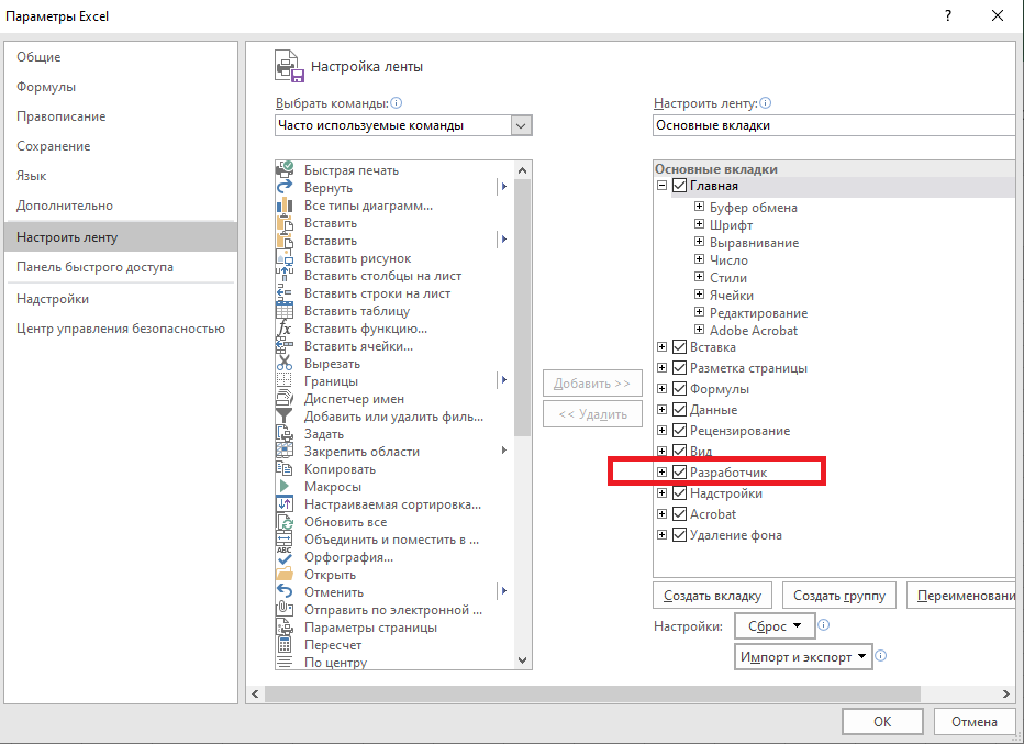 Для начала нам нужна вкладка Разработчик. По умолчанию её не видно, но включить легко: