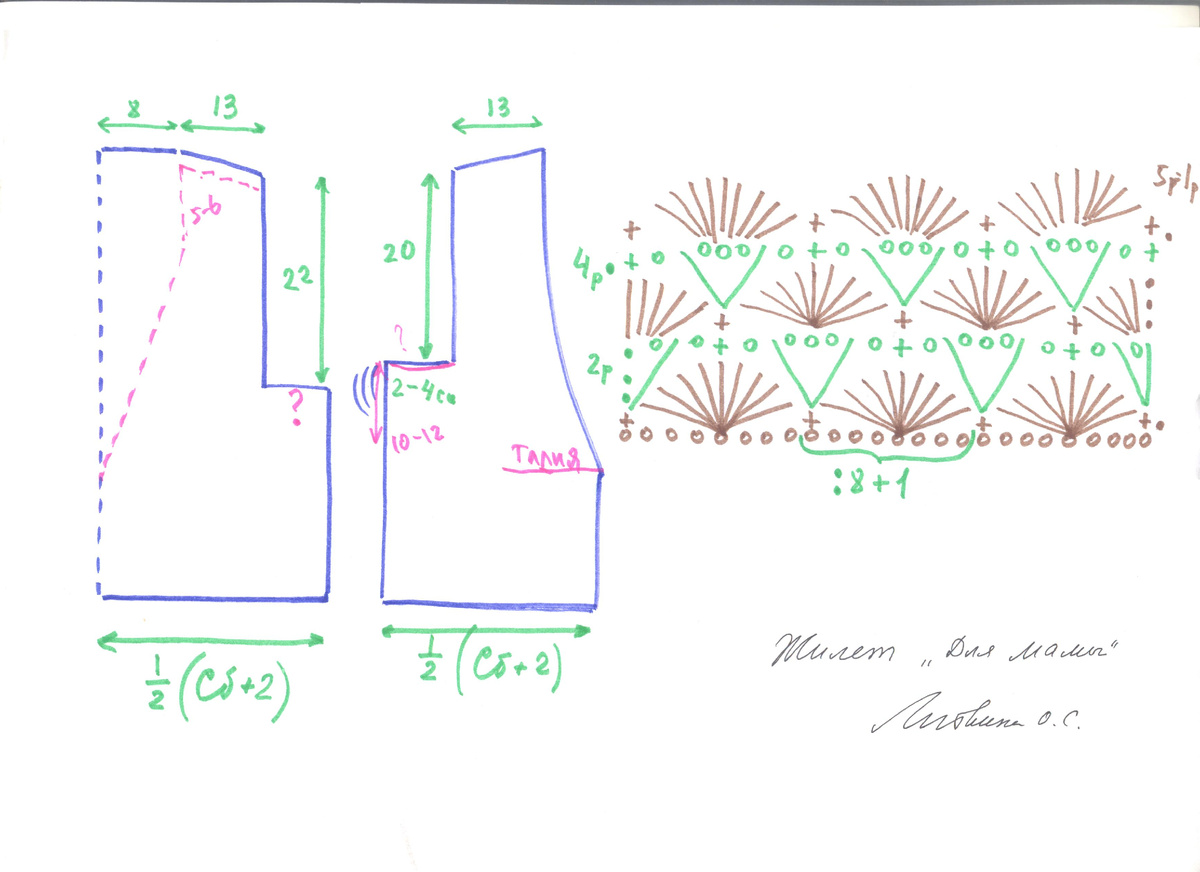 Используйте выкройку с квадратной проймой. Вяжите основное полотно простым полуажурным рисунком, по схеме.