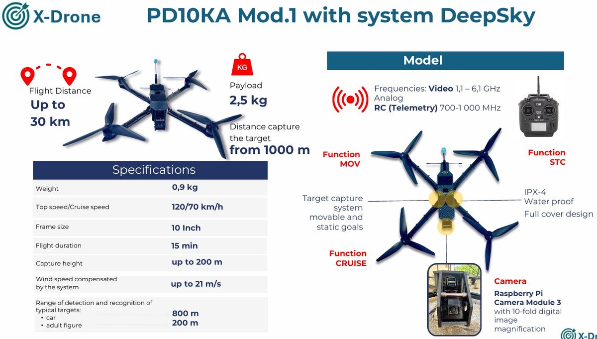Разработчик компания X-Drone. Размер рамы 10 дюймов. Вес пустого БПЛА 0.9 кг. Вес полезной нагрузки 2.5 кг. Максимальная скорость 120 км/ч. Круизная скорость 70 км/ч. Длительность полёта 15 минут. Дальность полёта до 30 км. Высота захвата цели до 200 м. Допустимая скорость ветра до 21 м/с. Дальность обнаружения и распознавания цели: автомобиль 800 м, ростовая фигура взрослого человека 200 м. Функция захвата и сопровождения цели. Аналоговое видео, частота 1.1 – 6.1. ГГц. Камера Raspbery Pi Camera Module 3 (c 10-и кратным цифровым увеличением). Частота канала управления и телеметрии 700 – 1000МГц. Ссылки 1. https://www.x-drone.tech/assets/dronex-specs-B7lm4I-l.png (подготовил Фролов И.В., к.т.н.) Перейти к оглавлению Справочника по БПЛА, используемых вооружёнными силами Украины