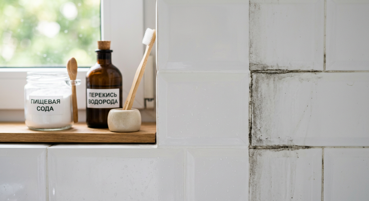 Забудьте про агрессивную химию. Нам понадобятся всего три простых компонента, которые уже есть у вас дома. Это обычная пищевая сода, перекись водорода и любая жидкость для мытья посуды. Почему именно они? Дело в том, что затирка для швов имеет пористую структуру — то есть она состоит из множества микроскопических ямок, как губка, куда легко забивается грязь. Сода работает как очень мягкий абразив — она бережно вычищает эти поры, не царапая глазурь плитки. Перекись — это источник активного кислорода. Она расщепляет органические загрязнения и уничтожает споры грибка без запаха. А средство для посуды великолепно растворяет стойкий жирный налёт от гелей для душа.