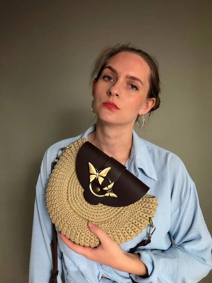 🌷 Эта маленькая сумочка сочетает в себе всё необходимое для комфортной прогулки весной. Несмотря на компактные размеры, она достаточно вместительна, чтобы поместить самые нужные вещи. Кожа высокого качества и стильный полиэфирный шнур добавляют ей элегантности и лёгкости. Что особенно привлекает — это гармоничное сочетание материалов и цветов. Цвет шнура прекрасно сочетается с оттенком кожи, создавая свежий и приятный образ. Что понадобится для изготовления сумочки: 1. Набор для вязания сумочки из натуральной кожи, бренд Сорока: • Клапан 20 см × 18 см; • Регулируемый ремень длиной 105–125 см; • Магнитный замок; • Кольца-карабины. 2. Полиэфирный шнур Promlatex: Цвет Сенди, толщина 4 мм, длина 200 метров (для одной сумочки использовано примерно половину). 3. Крючок диаметром 4,5 мм. Очень давно хотела связать эту модель сумки 🌷Теперь буду с ней гулять этой весной 🌷 Видео смотрим здесь 🩷 Как вам такая сумочка? #вязание_крючком