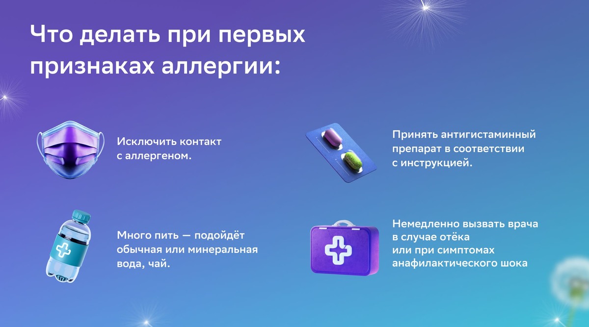 При первых признаках аллергии примите антигистаминный препарат. Всегда проверяйте инструкцию и дозировку, особенно если речь идёт о детях.