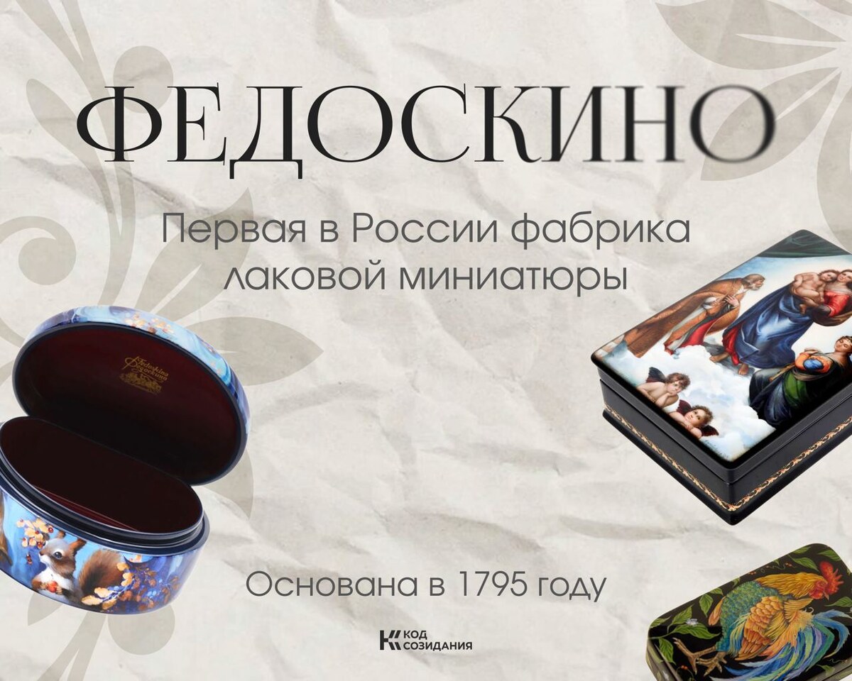 😊 В деревне Федоскино Московской области располагается один из самых известных центров русского декоративного искусства, история которого начинается в 1795 году. В своё время именно здесь появилась первая в России фабрика лаковой миниатюры, прославившаяся изделиями из папье-маше с живописной росписью. Главная особенность федоскинской школы – использование масляной живописи. Под слои краски нередко помещают перламутр, сусальное золото или серебро, благодаря чему изображение приобретает глубину и особое внутреннее сияние. 😊Сюжеты миниатюр отражают традиционные мотивы русской культуры: зимние тройки, сказочных персонажей, сцены народного быта, пейзажи и портреты. Работа над одной шкатулкой может занимать несколько месяцев, а каждая деталь выполняется вручную. За более чем два столетия изделия из Федоскино получили десятки наград на российских и международных выставках и пополнили музейные и частные коллекции по всему миру. 😊Сегодня фабрика продолжает сохранять старинную технологию
