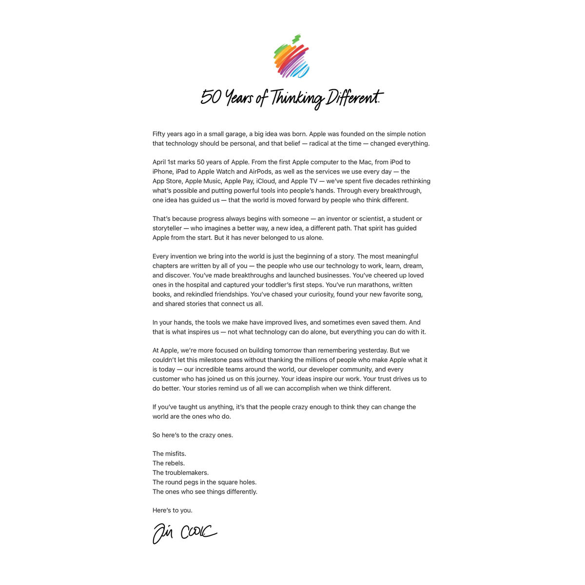 всем клиентам и пользователям. Главный посыл послания — технологии сами по себе ничего не значат без людей, которые ими пользуются. И с этим сложно поспорить... Пятьдесят лет назад в небольшом гараже родилась большая идея. Apple основали на простом убеждении, что технологии должны быть персональными — и эта вера, радикальная для того времени, изменила всё. Первого апреля исполняется 50 лет Apple. От первого компьютера Apple до Макинтоша, от плеера iPod до iPhone, iPad, Apple Watch и AirPods, а также сервисов, которыми мы пользуемся каждый день — App Store, Apple Music, Apple Pay, iCloud и Apple TV — мы провели пять десятилетий, переосмысливая возможное и вкладывая мощные инструменты в руки людей. Через каждый прорыв нас вела одна идея — что мир движут вперёд люди, которые думают иначе. Потому что прогресс всегда начинается с кого-то — изобретателя или учёного, студента или рассказчика — кто представляет лучший путь и новую идею. Этот дух направлял Apple с самого начала. Но он никогд