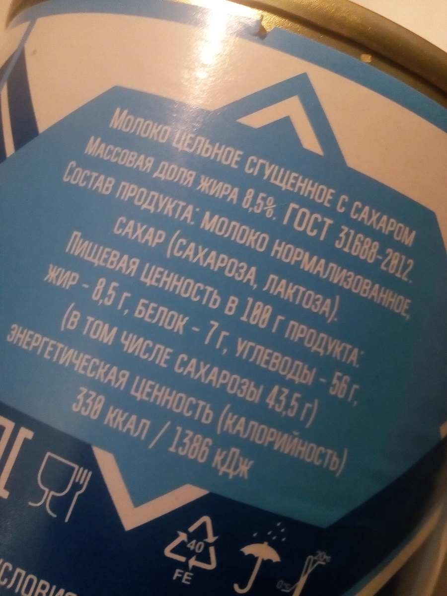 В сгущенном молоке есть кальций, калий, фосфор, витамины В2, В4 и В5, витамин А. В 100 г сгущенного молока (зависит от производителя и торговой марки) до добавления сахара содержится: 141 ккал. 6,4 г белка. 8,6 г жира. 9,5 г углеводов. (содержание может зависить от технологии - делают из сыворотки - или исходного молока) Для справки: