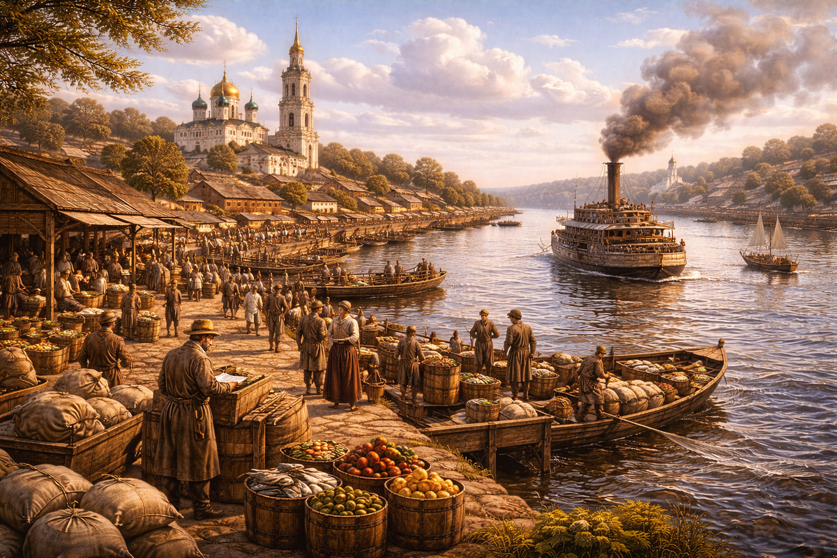 Иногда судьба города определяется одной рекой. Именно так произошло с Кинешма — старым волжским городом, который в XIX веке считался одним из самых оживлённых торговых центров на средней Волге. Сегодня он кажется спокойным и тихим, но сто пятьдесят лет назад здесь кипела жизнь: пристани были заполнены судами, улицы — купцами и рабочими, а над рекой постоянно поднимался дым пароходных труб. Путешественники, впервые приближавшиеся к Кинешме по Волге, видели город издалека. На высоком берегу стояли храмы, каменные купеческие дома и длинные ряды складов. К пристаням подходили баржи, лодки и пароходы, а на набережной всегда было многолюдно. Река делала город живым. По Волге приходили товары, новости и люди со всей страны. Благодаря этому Кинешма постепенно превратилась в один из самых известных торговых городов региона. В XIX веке жизнь Кинешмы была полностью связана с Волгой. Река была не просто природной границей — она была главной дорогой, по которой двигалась вся торговля. Утром на при