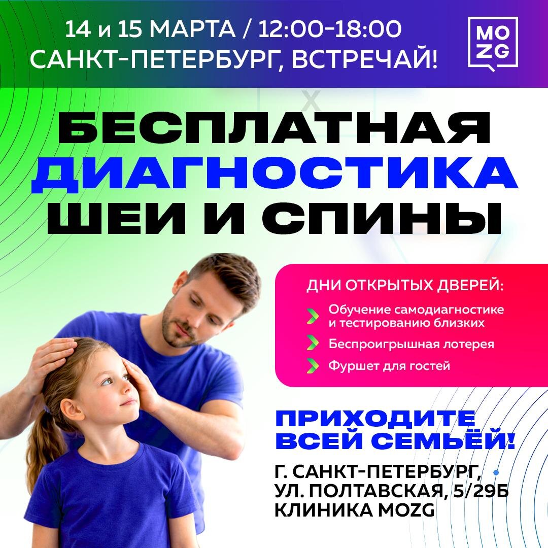 ! Анализы в норме, МРТ в порядке, а голова болит, спина ноет и нет сил? Всё дело в скрытых функциональных нарушениях, которые не видит обычная диагностика. Приходите на День открытых дверей в Санкт-Петербурге! ЧТО ВАС ЖДЁТ: 1️⃣ Обучение самодиагностике Вам дадут простые инструменты, чтобы проверять себя и близких (детей, родителей) без приборов. Вы научитесь замечать скрытые причины усталости, болей и нарушений в организме. 2️⃣ Бесплатный нейромышечный чек-ап (биомеханическое функциональное тестирование) Комплексная диагностика: асимметрии мышц, тонус, зажимы, перекос таза, состояние шеи. По итогу — вы получите личную диагностическую карту. 3️⃣ Личное общение с автором методов «Ренервация» и «Ревагус» Илья Бурлаковский — нейрофизиолог и основатель MOZG, ответит на ваши вопросы. 4️⃣ Беспроигрышная лотерея • Головоломки, антистрессы • Скидки до 50% • Главный приз — «Программа Х» за счёт клиники КОГДА И ГДЕ? 📍 г. Санкт-Петербург, ул. Полтавская, 5/29Б 🗓 14 марта (суббота) и 15