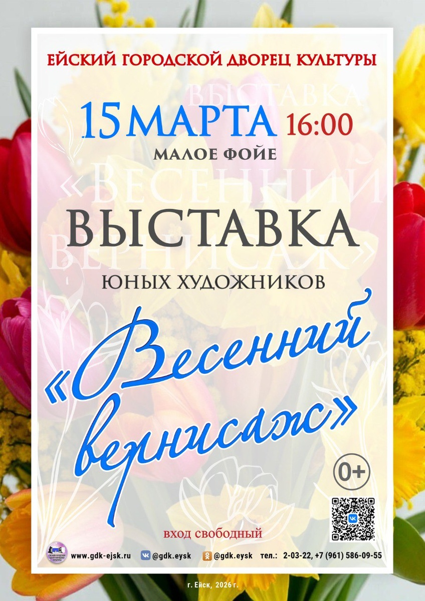 15 марта в 16:00 в Ейском городском дворце культуры в малом фойе пройдет выставка юных художников «Весенний вернисаж