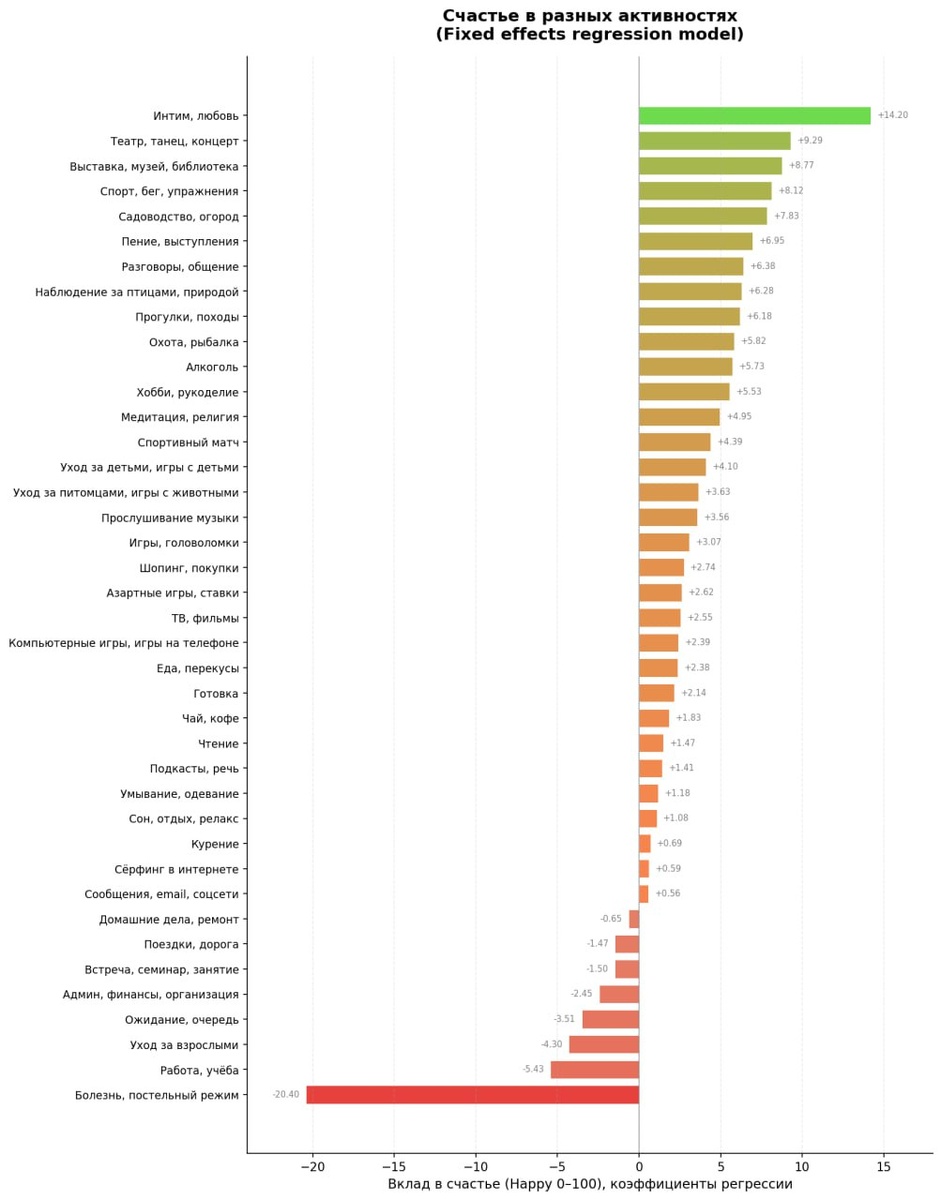 Исследование старое, но любопытное. В работе Are You Happy While You Work? ученые анализировали 1,3 млн моментов в самочувствии участников. Люди получали пуш на телефон и отмечали, что делают и как себя чувствуют в моменте. В целом, счастливыми нас делают ожидаемые простые вещи: — движение — общение — контакт с природой — культурный опыт — близость с другими людьми Работа оказалась почти в самом низу рейтинга счастья — хуже её только болеть в постели ♥️ п.с. прикольно видеть садоводство в топ 5, я всё еще продолжаю мечтать о своем огороде, но пока, в его отсутствии собираюсь высаживать мяту и салат на подоконнике ♥️