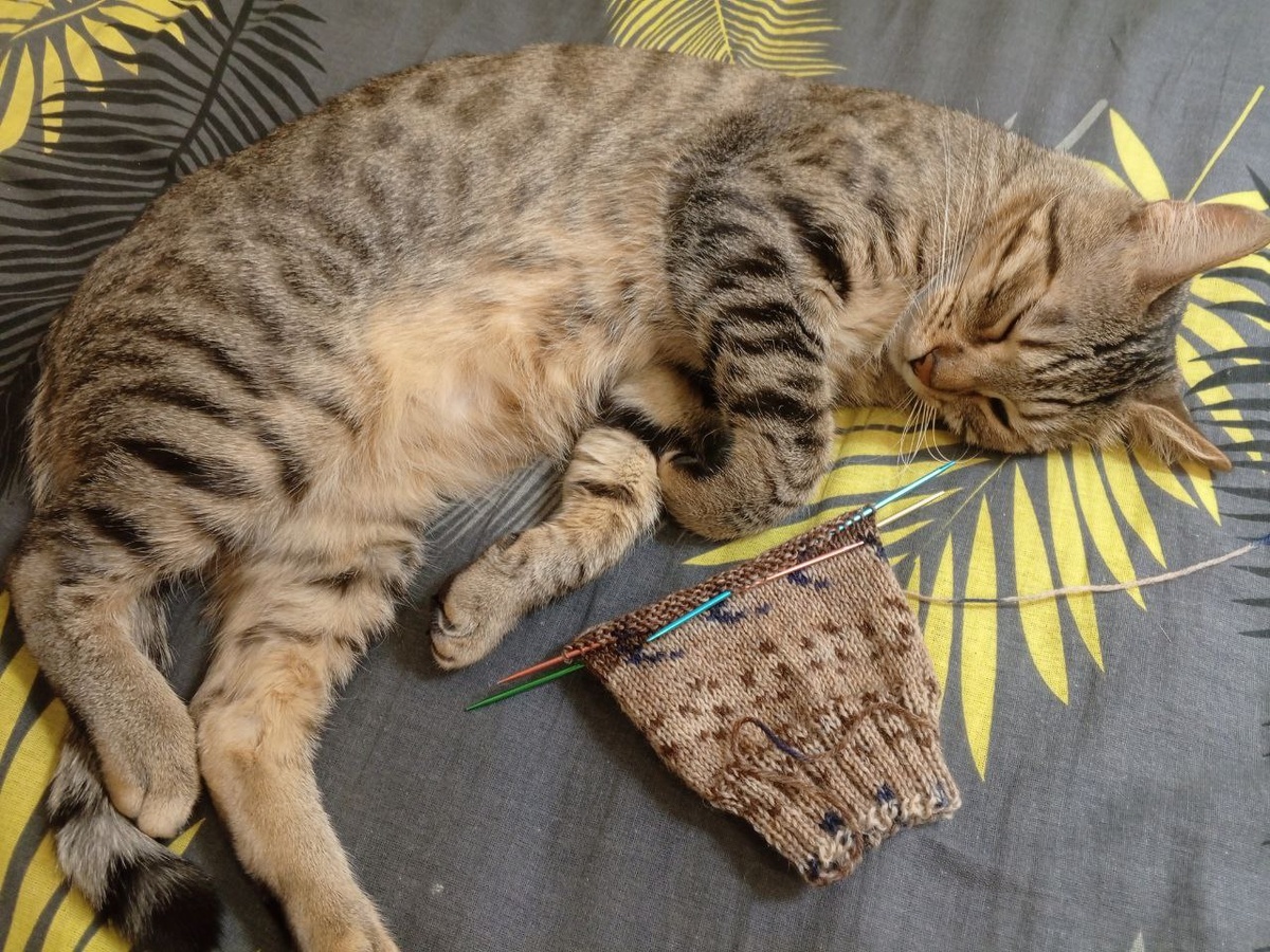 Котик вяжет новую парочку из Форза Йога. Устал..... Перерыв на сон😄