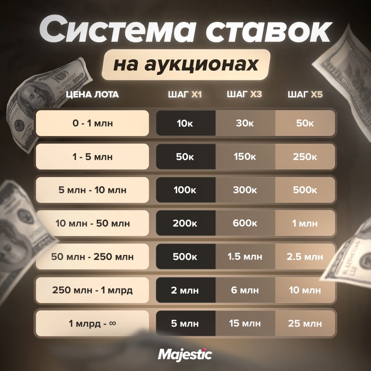 5, Π½Π°ΠΏΡΠΈΠΌΠ΅Ρ: β’ ΡΠ΅Π½Π° Π»ΠΎΡΠ° 200 ΡΡΡΡΡ: ΡΠ°Π³ 10ΠΊ / 30ΠΊ / 50ΠΊ; β’ ΡΠ΅Π½Π° Π»ΠΎΡΠ° 5 ΠΌΠΈΠ»Π»ΠΈΠΎΠ½ΠΎΠ²: ΡΠ°Π³ 100ΠΊ / 300ΠΊ / 500ΠΊ. β€οΈ Majestic