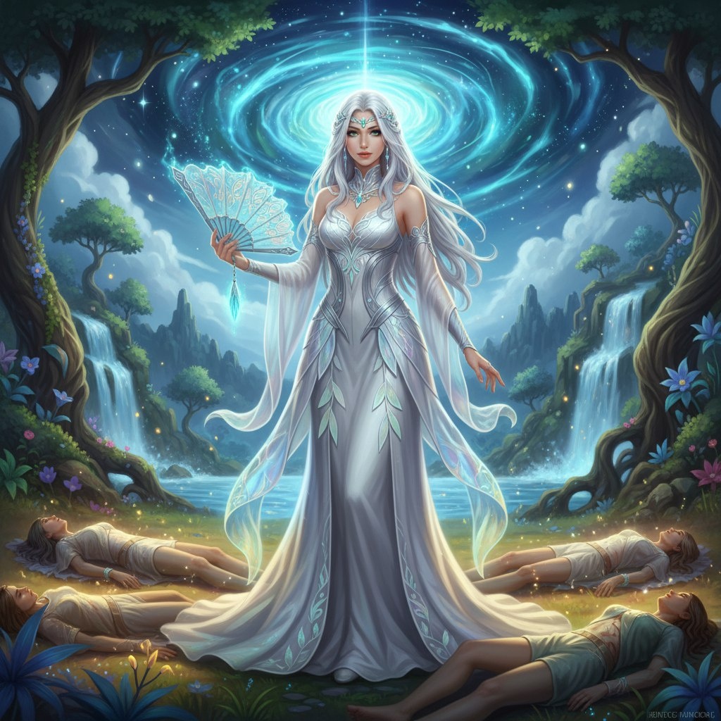 Демира — женщина тридцати лет, но выглядит значительно моложе благодаря дарам Белого дракона. Её облик излучает внутреннюю и внешнюю красоту: • Волосы: Белоснежные, контрастирующие с её молодым лицом • Глаза: Глубокого зелёного оттенка, полные мудрости и сострадания • Телосложение: Высокая и стройная фигура, излучающая благотворную ауру • Осанка: Величественная и уверенная, внушающая невольное уважение Демира происходит из расы Дев Энии — таинственного народа, обитающего на острове Эния под покровительством Белого дракона. Её воспитание было традиционным для её народа: • В раннем детстве была отправлена на уединённый остров • Там проходила обучение под воздействием особого витка космической энергии • Развивала мощную целительную магию и внутреннюю гармонию ▎Способности и магия ▎Целительная магия • Сильнейшая лекарка из ныне живущих • Прославилась тем, что однажды вылечила одновременно трёх смертельно раненых одним взмахом своего изящного веера • Может исцелять раны, болезни и даже ма