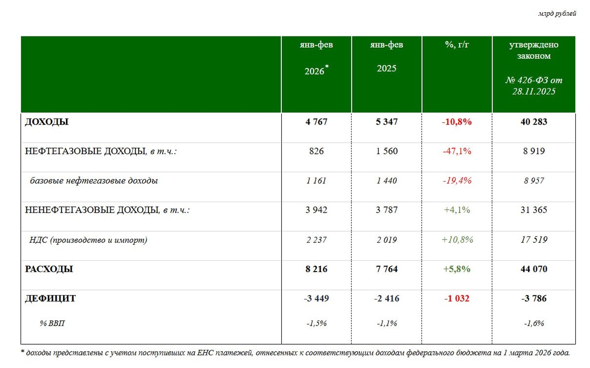 больше, чем профита. Кстати, это тот самый Райт, который говорил Трампу, что Иран ничего не сделает и никаких рисков для рынка нефти операция не несёт. «Украинская правда» сообщает, что европейцы попросили Зеленского «повоевать еще полтора-два года» и пообещали дать на это деньги. Про цену подобных решений я ещё напишу, а зачем это нужно Европе я рассказывал совсем недавно. Теперь к практике, потому что смысл всех этих действий — истощение России. В ЕС рассчитывают, что Россия рано или поздно проиграет войну по причине развала экономики, и у них есть основания так думать. Даже провластные экономисты едины во мнении, что 2026-й станет «первым тяжёлым годом» для России. Минфин опубликовал данные за первые два месяца 2026 года (слайд 1) и их можно назвать катастрофой: падение нефтегазовых доходов при сравнении год к году составило 47%, а дефицит бюджета за первые два месяца уже достиг 3,4 триллионов рублей. Последнее особенно важно, потому что запланированный на 2026 год дефицит всего