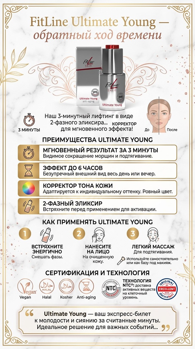 Наш 3-минутный лифтинг в виде 2-фазного эликсира в одном флаконе для мгновенного эффекта! Дома утром или в пути: Ultimate Young помогает сократить морщины за 3 минуты — эффект держится до 6 часов! Специальный корректор тона кожи обеспечивает идеальное совпадение продукта с вашим индивидуальным оттенком, поддерживая ровный и гладкий цвет лица. Ключ к ещё более безупречной коже! Перед использованием энергично встряхните флакон, чтобы смешать две фазы. Нанесите на очищенное лицо лёгкими массирующ 📖 Читать статью 🛒 Смотреть продукт