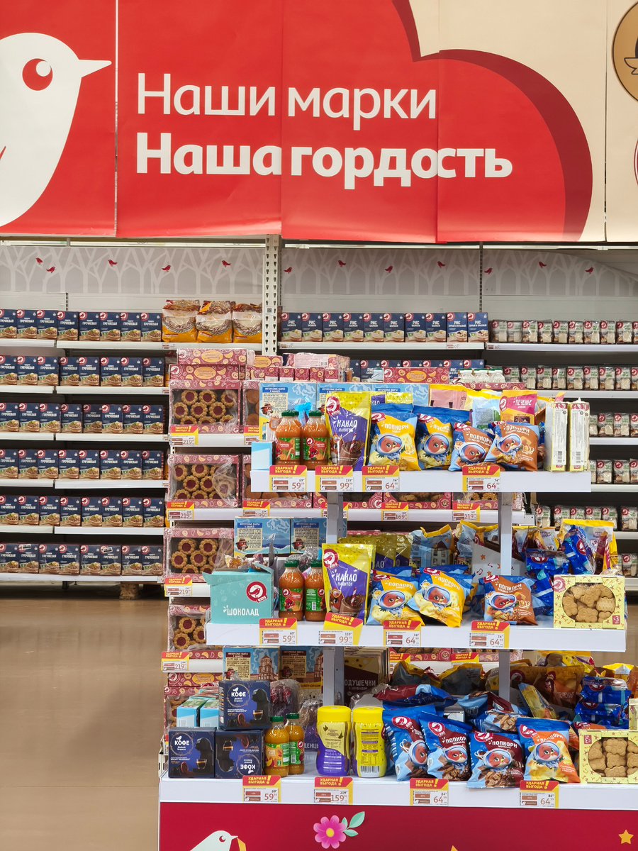 Вернёмся к продуктам. Даже протеиновые печеньки и какие-то энергетические гели по своей маркой Ашан выпускает. Целый стенд с такой продукцией.