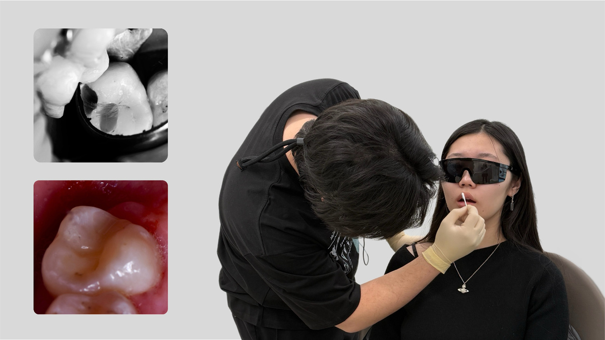 Помните строчку из песни Басты: «Наши дети будут лучше, чем мы»? Искренне верим в современное поколение докторов 😌 За последние 30 лет мир стоматологии круто изменился. От «потерпи, анестезия закончилась» до «вы не почувствуете укола». В наших руках гипсовые слепки превратились в цифровые модели. Очевидно, что и дальше будут появляться новые решения, которые сделают практику начинающих докторов более эффективной. В нашей клинике под контролем опытных врачей приступают к работе молодые специалисты. Ниже кейс одного из них👇 У пациента были визуально здоровые зубы. Но благодаря новому оборудованию в клинике (КТ), доктор увидел на снимке глубокий кариес 7-ки. Если бы не современная диагностика, через пару месяцев пациент мог прийти с пульпитом. Что было сделано: 1️⃣ Под увеличением удалены пораженные ткани, «подсвеченные» кариес-маркером 2️⃣ Созданы художественные композитные реставрации, повторяющие анатомию своего зуба. Теперь 7-ка здорова. Восстановлена и функция, и эстетика. Работа в