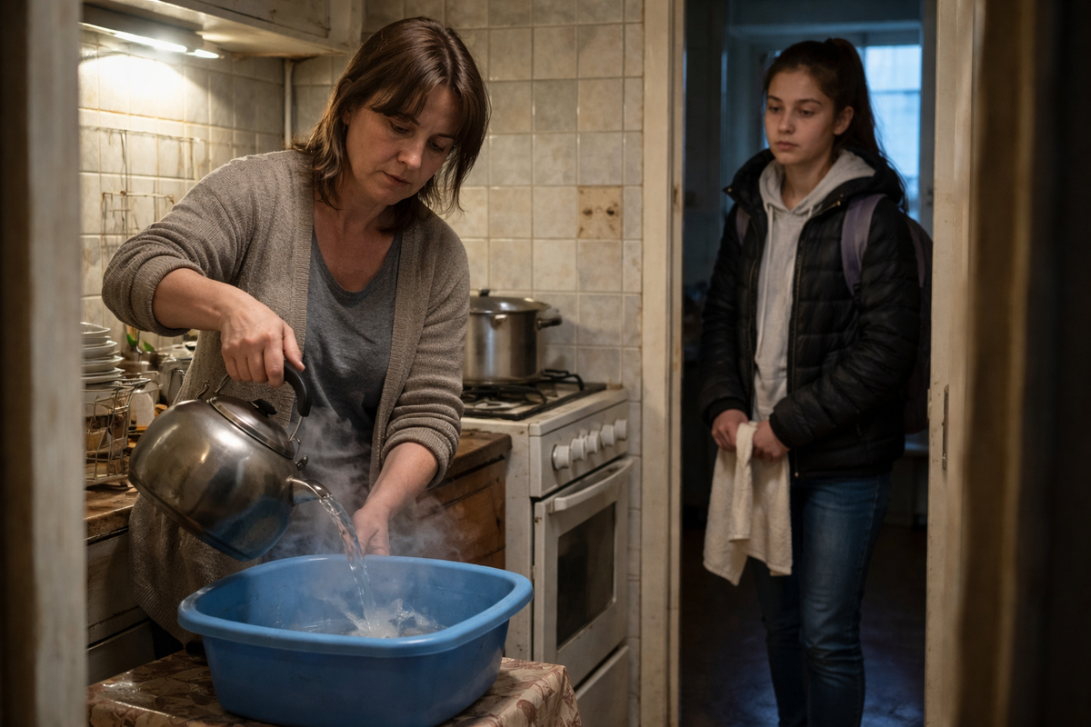 Минус восемнадцать на улице. В квартире батареи еле тёплые — это отдельная история, но не сейчас. Я просыпалась в шесть утра, ставила на плиту две кастрюли: одну для себя, одну для дочки. Она тогда была в восьмом классе — четырнадцать лет, школа в восемь. Пока вода закипала, я будила её, пока она умывалась холодной из-под крана, вода в кастрюлях доходила до нужного. Лили в таз. Мылись по очереди.