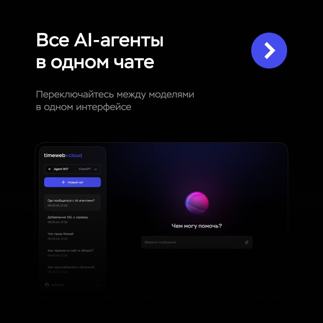 🥳 Добавили отдельный сервис на нашем домене, где вы сможете напрямую чатиться с агентами без виджета в панели и API. Удобно, когда хочется собрать все модели в одном месте и не переключаться между ними в плейграунде. Из интересного 1️⃣ Войти в панель = войти в чат. Если вы авторизованы в панели и у вас есть AI-агент, то чат откроется автоматически. 2️⃣ Все модели в одном месте. Можно переключаться между вашими агентами прямо в интерфейсе. 3️⃣ История диалогов. Чтобы продолжить любую тему из истории чата. 4️⃣ Настройки агентов сохраняются. RAG, MCP и другие параметры в панели тоже пробрасываются в чат. 5️⃣ На любой вкус. Светлая или темная тема интерфейса. В следующих итерациях — генерация изображений, возможность делиться чатом с другими, веб-поиск и режим размышлений. Собрать все доступные AI-модели в одном чате →