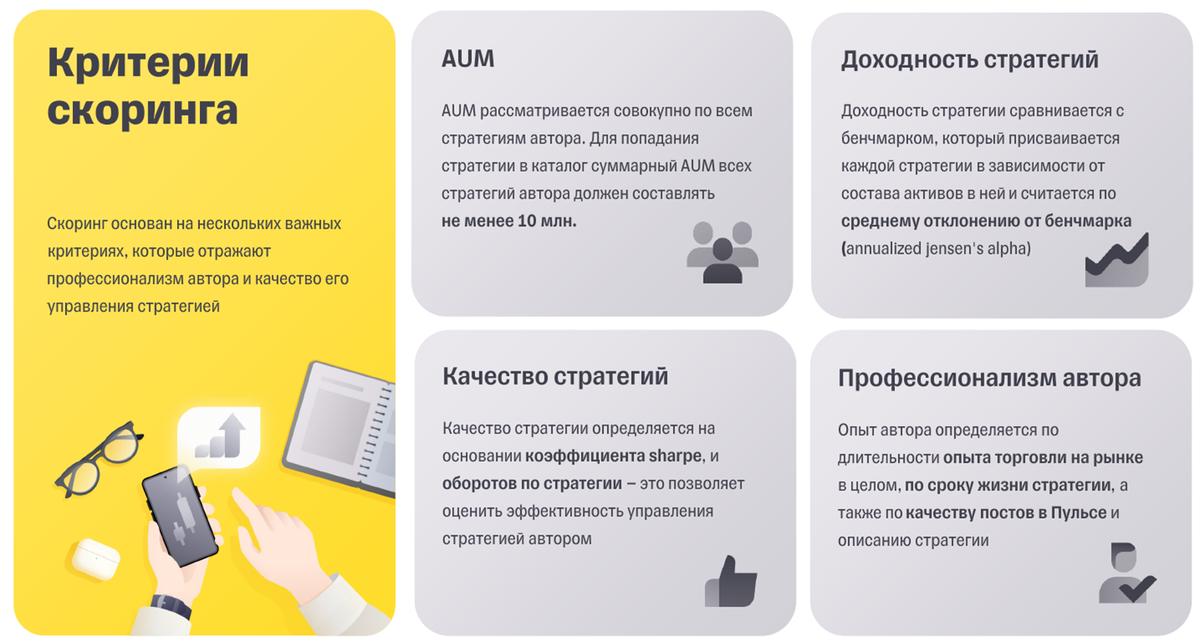 Разбираемся, что изменилось в автоследованиях: комиссии, каталог стратегий, контроль за авторами 📘Каталог стратегий С февраля у Т-Инвестиций обновился каталог автоследований. Из разрозненных стратегий, которые сложно сравнивать между собой, формируется «костяк» лучших предложений, которые Т проверяет по прозрачным критериям: 🔹доходность: стратегии сравниваются с релевантными бенчмарками. Акционные стратегии – с индексами акций, облигационные – с индексами государственных или корпоративных облигаций. Если стратегия отстаёт от бенчмарка до 5% - её проверяют коэффициентом Шарпа. Если >5% - стратегия не попадает в каталог 🔹профессионализм: опыт автора, качество постов, продолжительность работы со стратегиями 🔹стоимостной ценз: сумма на всех стратегиях автора ≥10 млн Теперь Т сам делаем первичный скоринг стратегий, и это позволяет рассчитывать, что в каталоге будут лучшие. Мы приветствуем сравнение с бенчмарками, т.к. и сами проводили такую работу. А теперь это стало прозрачнее и понятн