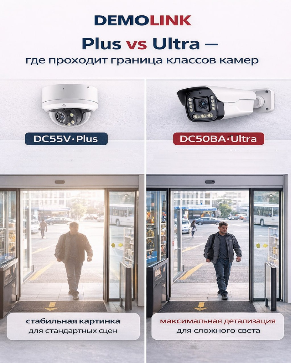 На практике камеры одного разрешения могут давать совершенно разный результат. Типичная сцена: 🚪 вход в магазин 🛒 кассовая зона 🏢 входная группа офиса На первый взгляд обе камеры — 5 Мп, и кажется, что разницы почти нет. Но в сложных условиях изображение начинает вести себя по-разному. Когда достаточно DC55V·Plus DC55V·Plus относится к усиленному Plus-классу — это уровень, который рассчитан на стабильную работу в обычных задачах наблюдения. Такие камеры хорошо справляются с ситуациями, где есть: — переменный свет — движение людей — стандартные входные зоны Камера использует 5 Мп сенсор (2592×1944) и моторизованный объектив 2.7–13.5 мм с автофокусом, что позволяет точно настроить плотность кадра под конкретную сцену. Также камера поддерживает: • WDR 130 дБ • интеллектуальную обработку изображения (3D DNR, BLC, HLC) • ИК-подсветку до 35 м В результате Plus-камера даёт стабильную и предсказуемую картинку в большинстве стандартных задач видеонаблюдения. Когда нужен уровень Ultr