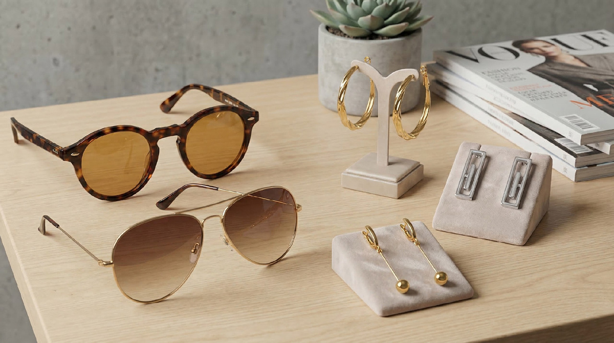 - Очки‑акцент (яркие цвета) → серьги нейтральных оттенков или прозрачные детали. Так аксессуары не создают визуального «шума».