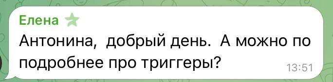!!! Уже рассказывала про триггеры, а другим язычком препятствия судьбы - https://dzen.ru/media/id/674d43a057eb8048e2684405/pogovorim-o-teh-samyh-prepiatstviiah-kotorye-ne-daiut-sebia-ne-zametit-i-ne-daiut-priiti-k-celi-69772c53069778267bf69d97 И тут подкаст на эту тему - https://t.me/Antoninaaleksandro/2464 Еще есть консультация где вы узнаете все свои триггеры - https://dzen.ru/media/id/674d43a057eb8048e2684405/-konsultaciia-6979b6960707b35448211f57