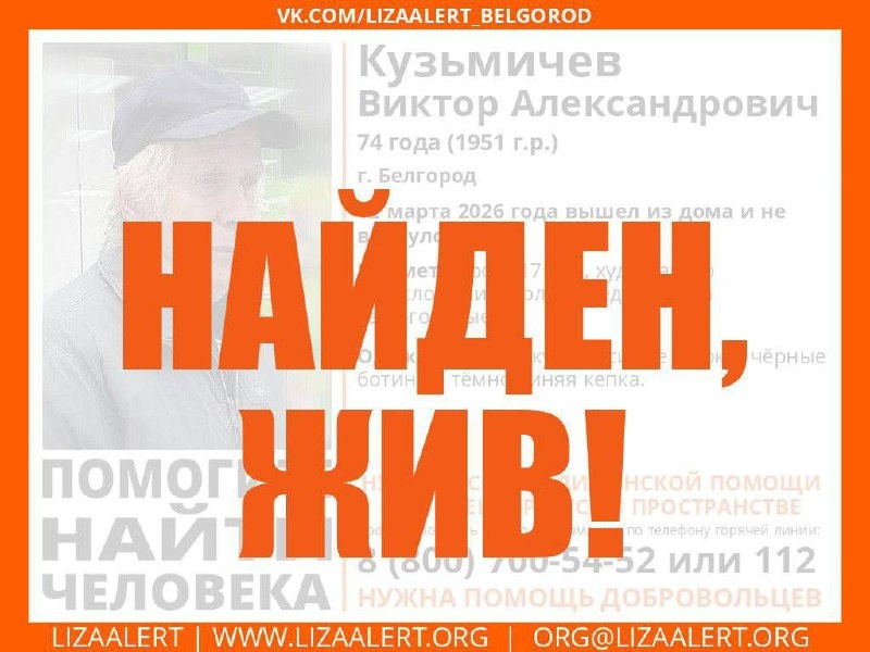 ! Внимание! Пропал человек! 12 марта 74-летний Виктор Александрович Кузьмичев вышел из дома и не вернулся. Сообщается, что он нуждается в медицинской помощи. Если вам что-либо известно о его местонахождении, просьба сообщить по телефону горячей линии поискового отряда «ЛизаАлерт» 8-800-700-54-52 (бесплатно по России) или по номеру 112. ❕ Жесть Белгород - подписаться