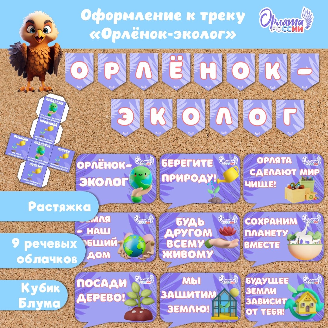 Оформление к внеурочной деятельности «Орлята России» (речевые облачка, растяжка), трек «Орлёнок-эколог» — это эффективный инструмент для создания яркого, информативного и мотивирующего пространства в классе. Оформление представлено в фирменном стиле общественного движения школьников Орлята России. В набор для оформления входит: Данный комплект предназначен для оформления информационного стенда, классного уголка или школьной доски Файл в PDF-формате на листах А4. В процессе печати можно настроить необходимый размер материалов.