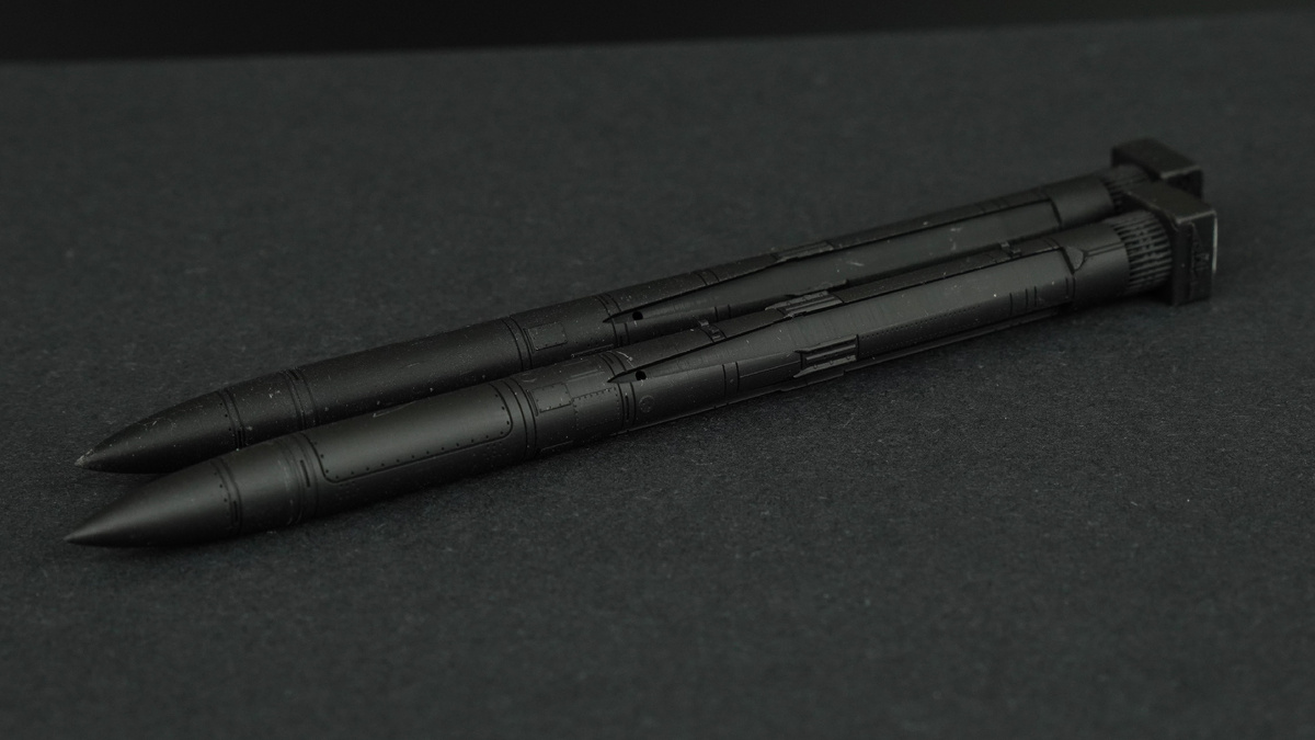 Далее маслом вывел серые цвета в нужный мне оттенок и добавил белесости и загрязнений на отсек с БЧ. Верхняя ракета - после.