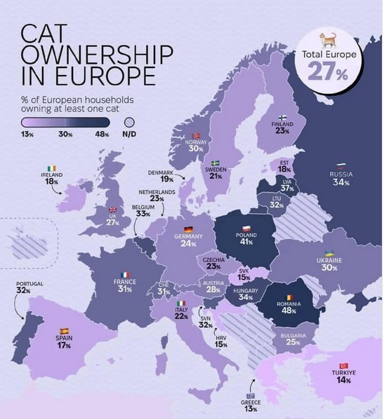 Кошковладельцы в Европе. У нас их почти вдвое меньше, чем в Румынии, интересно, почему. А в Турции на удивление мало, хотя считается, что там котиков - ну просто завались (возможно, они все уличные?)