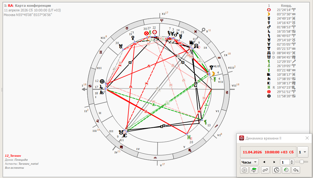Для проверки работоспособности предлагаемого метода, в качестве примера будет оцениваться карта рождения конференции, которая должна состояться под началом Московской академии астрологии 11-12 апреля 2026 года. Думаю, что никто не станет оспаривать, что энергетика этой карты должна влиять на каждого из участников конференции, а значит и обозначатся какие-то итоги достижений, которые тоже будут влиять на всех её участников и тем самым создавая каждому из них определённое удовлетворение от своего участия в этой конференции.