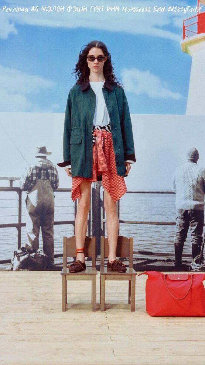 Такой визуал медленной жизни на природе. В основе — вещи, напоминающие гардероб рыбака: плащи и парки, растянутые свитера, кроше — как будто ты нашел что-то классное и любимое на дачном чердаке и застилизовал с актуальным денимом, миди-юбками и брюками-баллонами. В лукбуке у них больше классики — синий, красный и полоски, но загляните на сайт, там очень много классных вещей в том же стиле и более мягких цветах: коричневый, серый, оттенки бежевого. Футболка с сардинами — просто любовь.