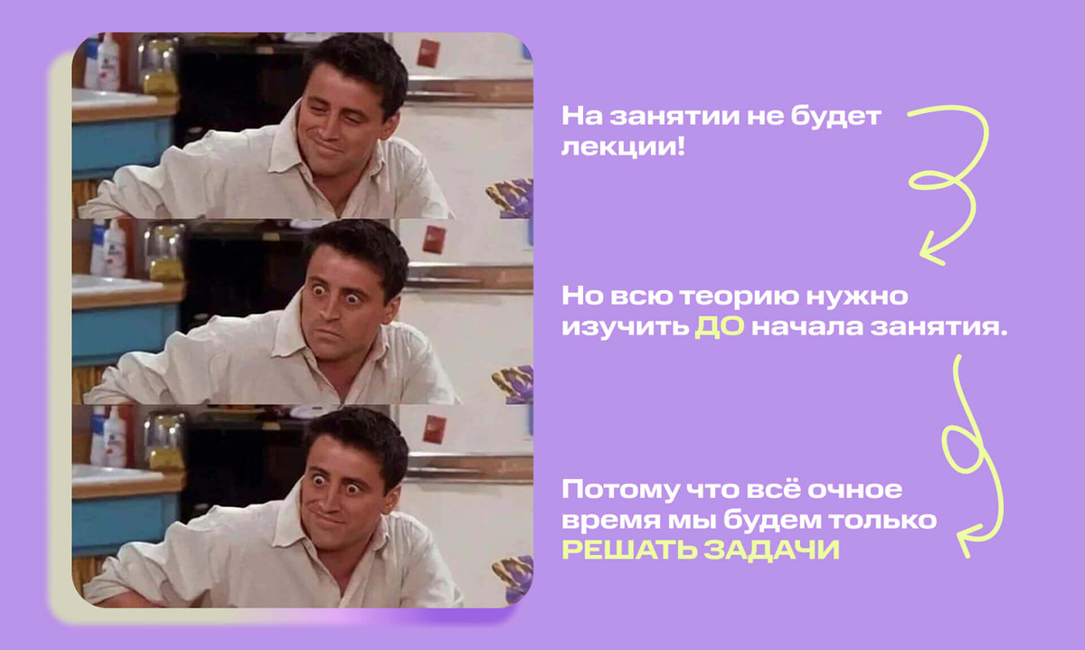 «Перевёрнутый класс» — это образовательный формат, который предполагает, что студенты знакомятся с теорией самостоятельно, ещё до встречи с преподавателем. А занятие посвящается уже не лекциям, а разбору реальных ситуаций и решению задач.