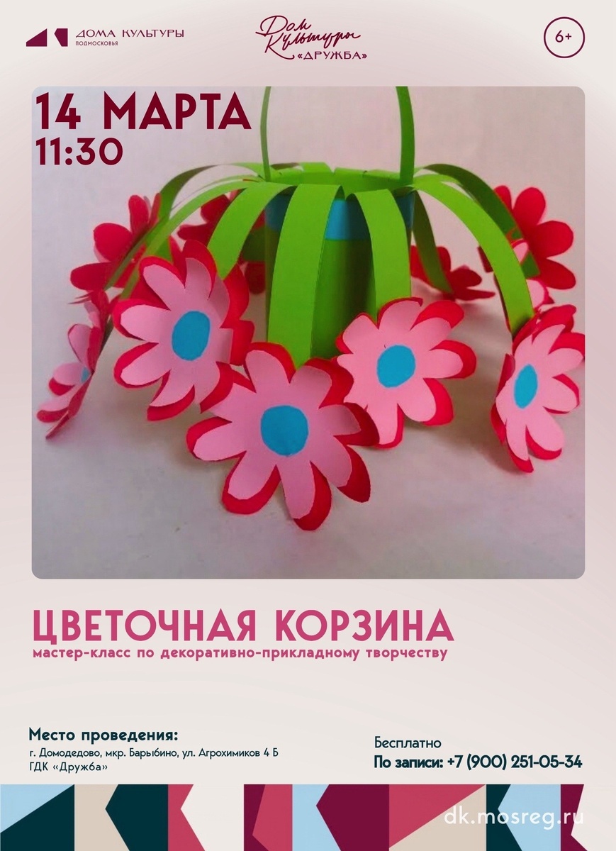 ✨ В эту субботу состоится творческая мастерская для детей. Ребята изготовят забавные цветочные корзинки. Развиваем фантазию и гармонично развиваемся. Каждую субботу мы собираемся вместе: 😄 просмотр мультфильмов ☺️ проведение мастер-классов 🤝 знакомство и общение с друзьями СКОРЕЕ ПРИСОЕДИНЯЙСЯ! 🚫 Возраст: 6+ 📆 14.03.2026🕒11:30 🏢 Городской дом культуры «Дружба» 📍 г.о. Домодедово, мкрн.Барыбино, улица Агрохимиков, д.4Б 💰 Вход свободный❗️ ✅ Мероприятия Домодедово https://dzen.ru/id/66f10385cc4c5a16f7b5fb02 https://vk.ru/domodedovo_events http://dzen.ru/domodedovo_events