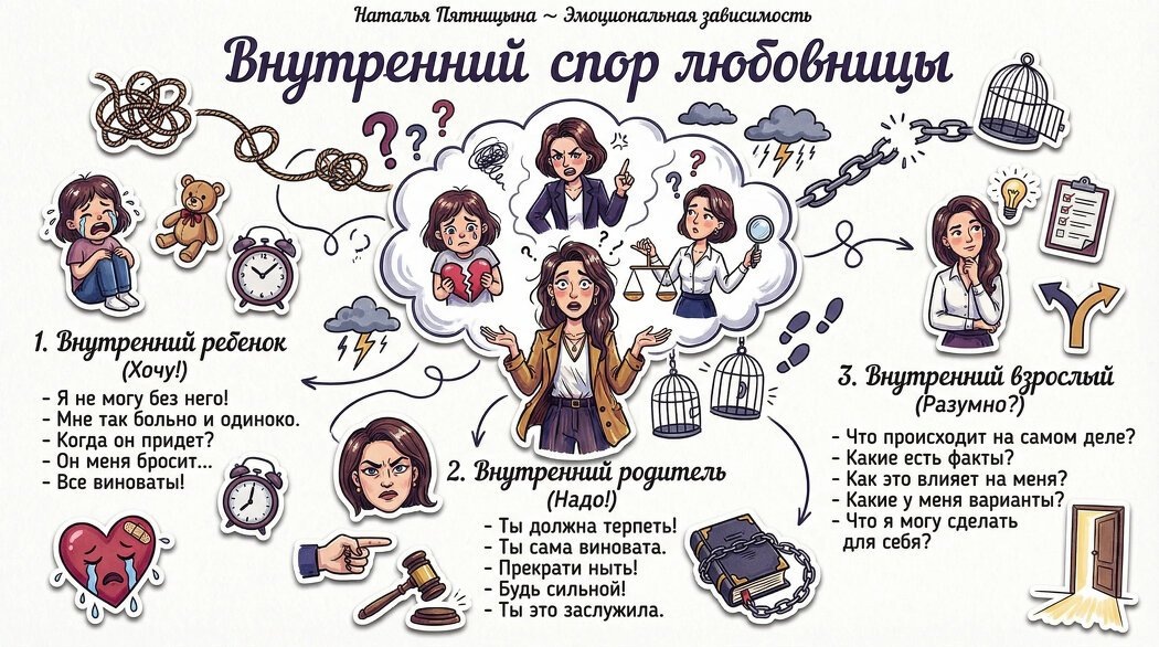 Как психолог по отношениям я часто слышу похожие жалобы: «Каждые выходные любовник с семьёй, а я снова одна - почему он не пишет?» или «Я чувствую себя запасным вариантом и не понимаю, как пережить эти выходные». В статье разбираю, почему ситуация, когда любовник на выходных с семьёй, а вы снова одна, вызывает такую сильную боль, и что с этим делать через модель транзактного анализа - внутренний конфликт между Ребёнком, Родителем и Взрослым. Пятница. Вечер. Я вижу, что он онлайн, но не пишет. Я снова открываю поисковик и набираю: почему любовник не пишет на выходных, как пережить выходные, если он с семьёй. Внутри всё замирает. Я понимаю, что сейчас он может ужинать с женой или проводить время с детьми. А меня ставит на паузу на эти дни. Я злюсь на него. Но ещё сильнее - на себя. Потому что снова проверяю телефон каждые несколько минут и чувствую себя… запасным вариантом Состояние эмоциональной ломки и самообвинения знакомо многим женщинам, оказавшимся в любовном треугольнике. В будни