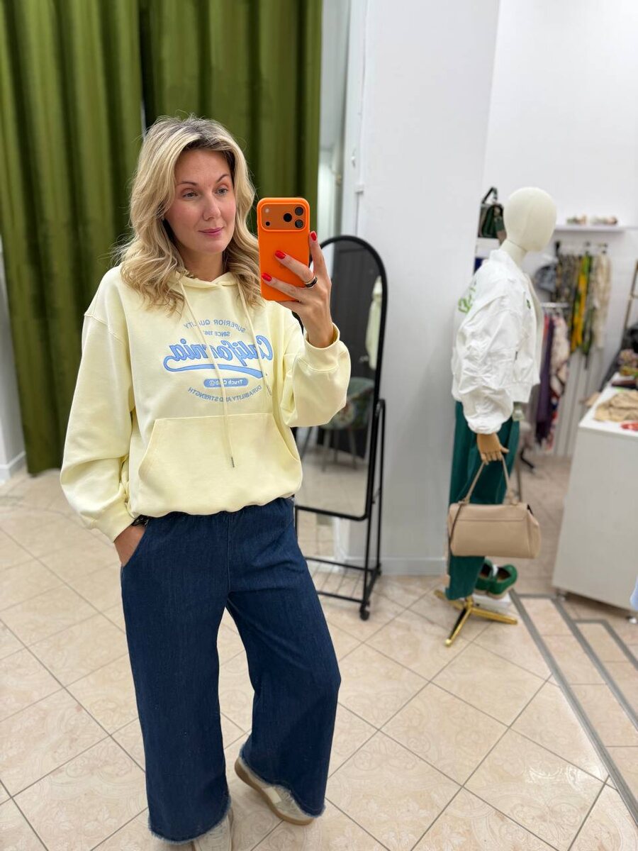 Хлопковый свитшот Размеры 42-52 Стоимость 7950 Джинсы палаццо Размеры 42-52 Стоимость 7950 Италия Куртка Размеры 42-50 Стоимость 13950 Белый джемпер Размеры 42-48 Стоимость 4950 Палантин Стоимость 2500