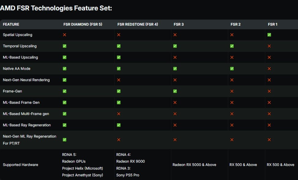 Предварительная сравнительная таблица, демонстрирующая, какие функции поддерживаются в разных версиях FSR.
