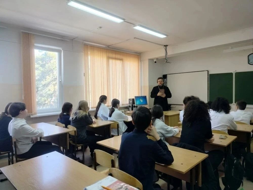 11 марта 2026 года в стенах средней школы №5 имени Мурадяна (мкр. Парус, 25) прошла встреча с учащимися 7 класса, которую ребята запомнят надолго. Настоятель нашего Свято-Преображенского храма, протоиерей Михаил Смирнов, посетил учащихся, чтобы поговорить о важном — о Дне православной книги. Отец Михаил рассказал школьникам о том, какой долгий и трудный путь прошла книга, прежде чем стала такой, какой мы привыкли ее видеть. Ребята с большим интересом слушали рассказ о рукописных книгах, над созданием которых монахи-переписчики трудились годами, выводя каждую букву. Особое внимание было уделено истории книгопечатания на Руси. Отец Михаил напомнил ребятам, что начало печатанию книг положил первопечатник Иван Федоров, и рассказал о том, в каком году произошло это судьбоносное для культуры событие. Школьники узнали, что православная книга — это не только богослужебная литература, но и глубокие, мудрые издания, которые учат добру, милосердию и любви к ближнему. Живой диалог, внимание и