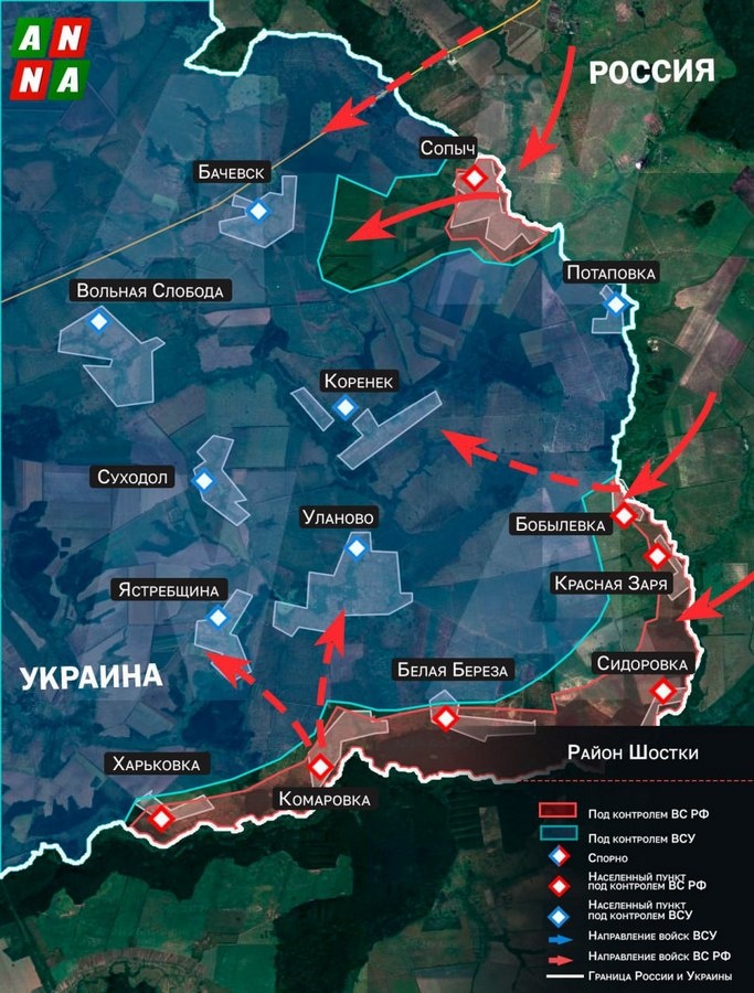 В ходе создания буферной зоны безопасности в Сумской области группировка войск «Север» ВС РФ освободила уже семь населенных пунктов в Шосткинском районе, включая село Сопычь. Как напоминает известный военный эксперт Борис Рожин, это на границе с Рыльским и Хомутовским районами Курской области. По данным Рожина, российские подразделения прорвались на 3,5 км вглубь – в сторону Бачевска, важного узла снабжения и обороны ВСУ на этом участке фронте. Его противник также использовал для заброски диверсантов на территорию России. С этих позиций шли и атаки ВСУ на наше приграничье дронами и артиллерией. Задачей новой операции ВС РФ эксперт называет срезание «выступа» по линии Студенок — Кучеровка — Бачевск, который угрожает приграничному селу Крупец Рыльского Курской области. Если наши военные освободят от ВСУ Бачевск, следующими целями станут Уланово, Кучеровка и Студенок, считает Борис Рожин. Опираясь на них ВС РФ смогут наступать глубже, создавая угрозу для противника в поселке Эсмани. Это с