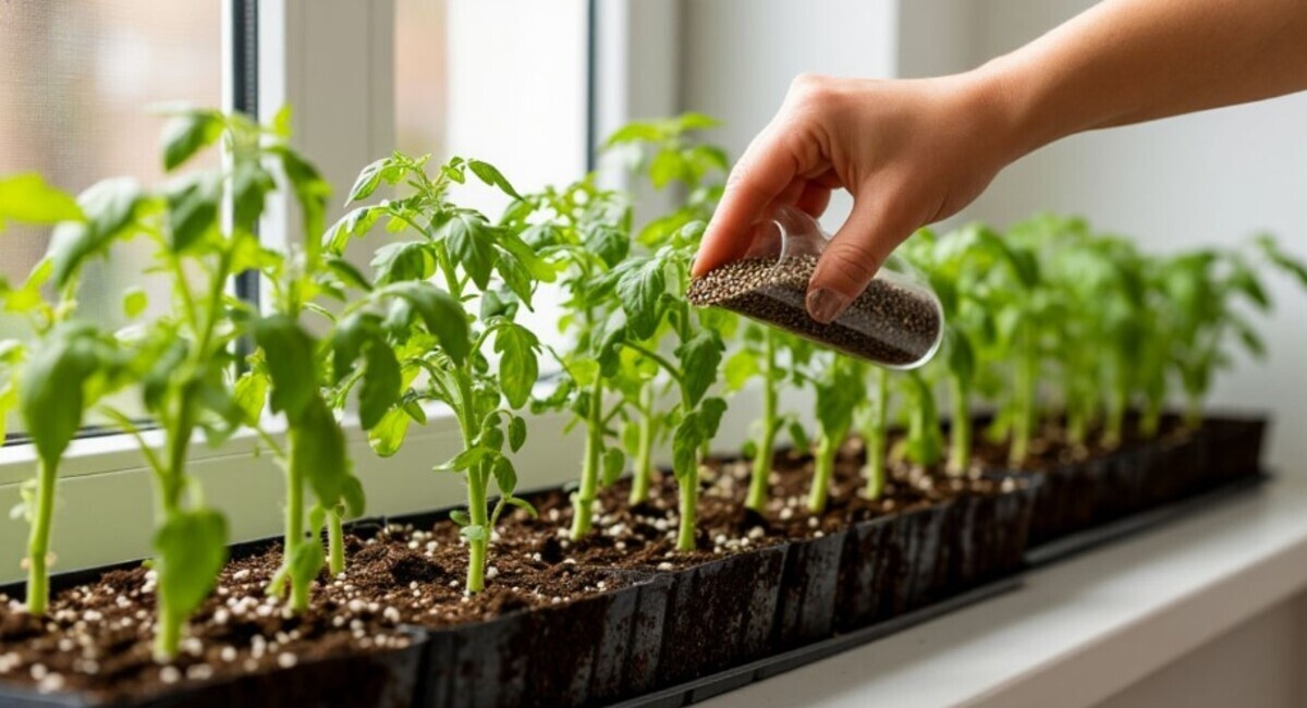 Знакомая картина: рассада тянется вверх, стебли тонкие, как спички, вот-вот переломятся. Высадишь в теплицу — болеет, чахнет, урожай откладывается на недели. Казалось бы, и лампы поставил, и температуру отрегулировал, а результат тот же. Оказывается, всё дело в трёх простых добавках, которые добавляют в грунт при пикировке. Копеечные, доступные каждому — и рассада становится приземистой, с толстым стеблем, а после высадки приживается за 5-7 дней без стресса. Ошибку понял не сразу. Перепробовал всё: лампы, переставлял ящики, менял температуру. А рассада всё равно тянулась. Потом дошло: главное закладывается при пикировке. Именно в этот момент томат активно наращивает корни. Если грунт бедный, корни слабые — растение компенсирует вытягиванием стебля. Фосфор — основа мощной корневой системы. Без него томат не нарастит нормальные корни. Но многие используют суперфосфат неправильно: сыплют гранулы на дно стаканчика. При первом же поливе они проваливаются в поддон — и толку ноль. «Я тоже так
