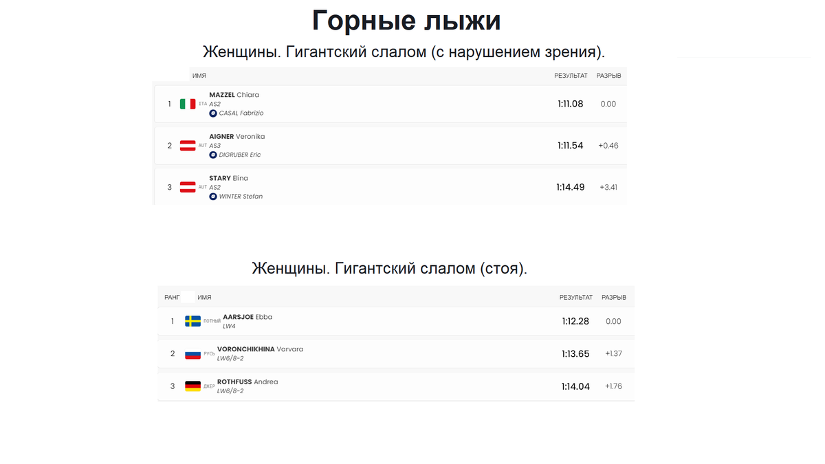 Сегодня на зимней Паралимпиаде разыграли 3 комплекта медалей. Горные лыжи. Женщины. Гигантский слалом (с нарушением зрения). Кьяра Маззел из Италии показала лучший результат – 1 минута 11,08 секунды. Серебро у Вероники Айгнер из Австрии. Бронза у другой австрийки Елены Стари. Женщины. Гигантский слалом (стоя). Эбба Оршьё из Швеции была первой с результатом 1 минута 12,28 секунды. Варвара Ворончихина из России была второй, отстав от лидера на 1,37 секунды. Третьей пришла Андреа Ротфусс из Германии. Женщины. Гигантский слалом (сидя). Анна – Лена Форстер принесла Германии золотую медаль. У японки Мураоко – серебро. Бронза досталась Кивиранте из Финляндии. Завтра, в пятницу 13-го, будет разыграно 10 комплектов медалей в горных лыжах, парабиатлоне, кёрлинге на колясках. Кто лидирует в медальном зачёте? КНР – 10 золота, 7 серебра, 10 бронзы. США – 6 золота. Австрия – 5 золота. Россия – 4 золота. Услышимся завтра на «спортивном».