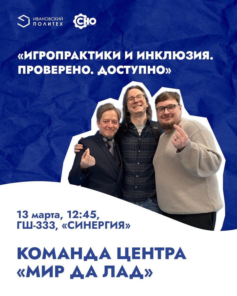 »! В пятницу на новой лекции «Политех.Лекторий» встречаемся с командой проекта «Проверено. Доступно». Это люди, которые на практике знают, как сделать досуг по-настоящему интересным для всех. Поговорим о главных вызовах инклюзивных игротек: 🔹 Как из обычной игротеки сделать инструмент социализации? 🔹 Как адаптировать игры так, чтобы в ней было комфортно играть смешанной группе? 🔹 Кто такие «волонтеры-игротехники» и почему без них никуда? 📅 13 марта, 12:45 📍 ГШ-333 (пространство «Синергия») 🚀 Приходите, если вы волонтер, игропрактик или просто хочешь научиться создавать события, объединяющие разных людей. 👻 ИВГПУ в MAX | 📲 ИВГПУ в ВК 👻 Приемная комиссия ИВГПУ