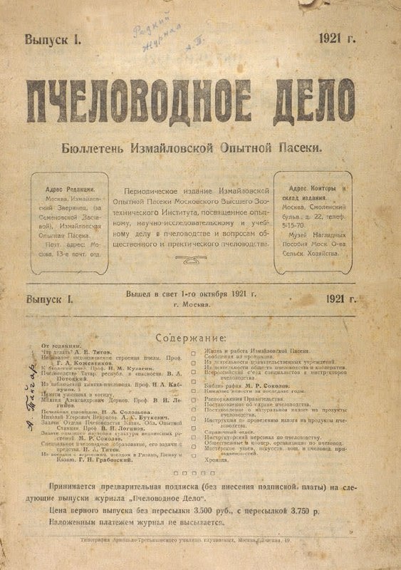 Журнал «Пчеловодное дело» издавался в Москве с октября 1921 года по 1930 год