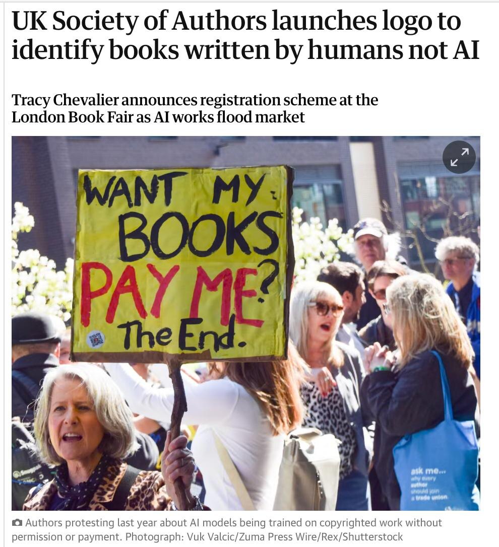 Общество авторов страны предложило издательствам использовать знак «Human Authored» для книг, которые создавались без ИИ. По задумке, они хотят, чтобы читателю было просто отличить литературу от текстов ИИ. Писатели говорят, что ИИ не только покушается на литературный процесс, но и обучается на текстах живых людей, а они за это ничего не получают. К слову, идея маркировать книги достаточно хорошая. Но вот кто это проверять будет? Загадка… @lobushkin
