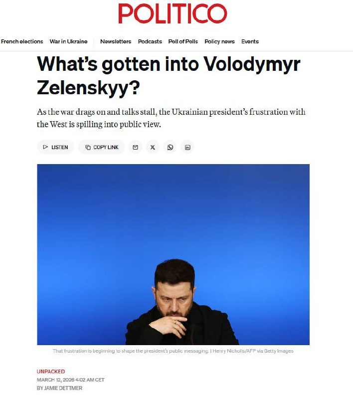 Издание критикует недавнюю угрозу Зеленского отправить солдат ВСУ к Виктору Орбану. По мнению Politico, это показывает западным столицам, что именно Украина препятствует мирному разрешению конфликта. Неужели глупцы что-то начинают понимать Politico: Selenskyj verliert die Geduld mit dem Westen Die Publikation kritisiert Selenskyjs jüngste Drohung, ukrainische Soldaten nach Viktor Orban zu entsenden. Laut Politico zeige dies den westlichen Hauptstädten, dass die Ukraine eine friedliche Lösung des Konflikts verhindere. Begreifen die Narren es endlich?