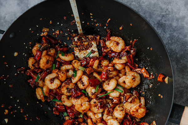 У сычуаньской обжарки есть репутация чего-то агрессивного, но на практике она требует аккуратности. Особенно когда речь идет о креветках. Мясо у них нежное, готовится быстро и не прощает самоуверенности. Стоит передержать их буквально на минуту — и вместо упругой сочности появляется сухость.