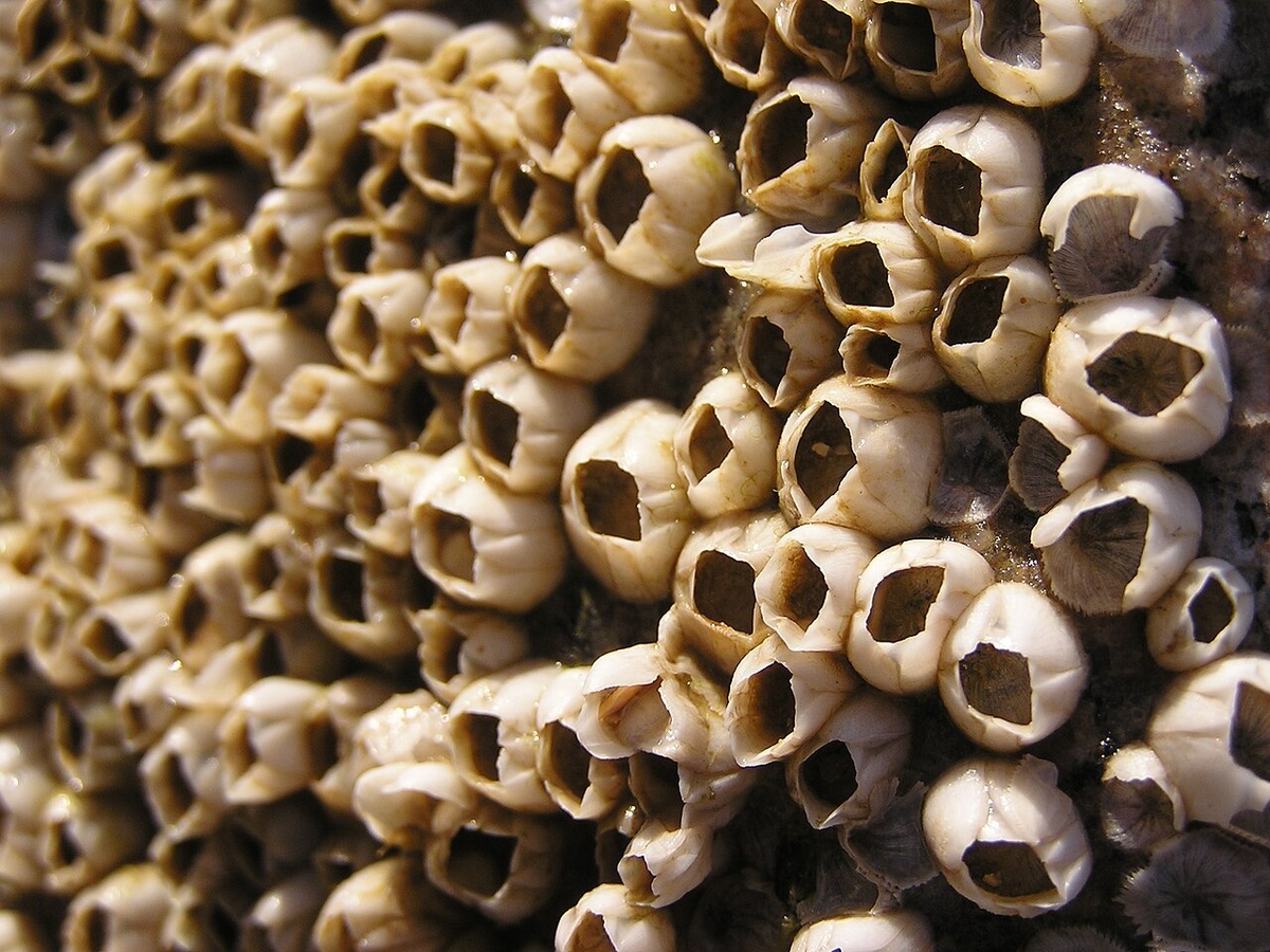 Прятаться в собственном домике, запирая дверцу на замок – отличная стратегия для выживания. Морские желуди (балянусы) - представители Усоногих ракообразных – согласны с этим утверждением и в ходе эволюции отказались от свободного перемещения во взрослом состоянии в пользу тихой жизни затворника в небольшой известковой раковине. При этом основание раковины прочно цементируется на поверхности подходящего субстрата: корягах, днищах морских судов, подводных скалах. Для выработки «строительного материала» они используют цементные железы, расположенные у основания коротких усиков. Известно около 60 видов морских желудей. Длительное время зоологи ошибочно относили их к моллюскам. Внешний вид такого «домика» напоминает миниатюрный кратер вулкана (или пустую луковицу лилии…), из жерла которого балянусы выставляют гребущие грудные ножки. За счет их быстрых, ритмичных движений создается приносящий ток воды, а вместе с этим обеспечивается хороший газообмен в жабрах, доставка питательного планктон