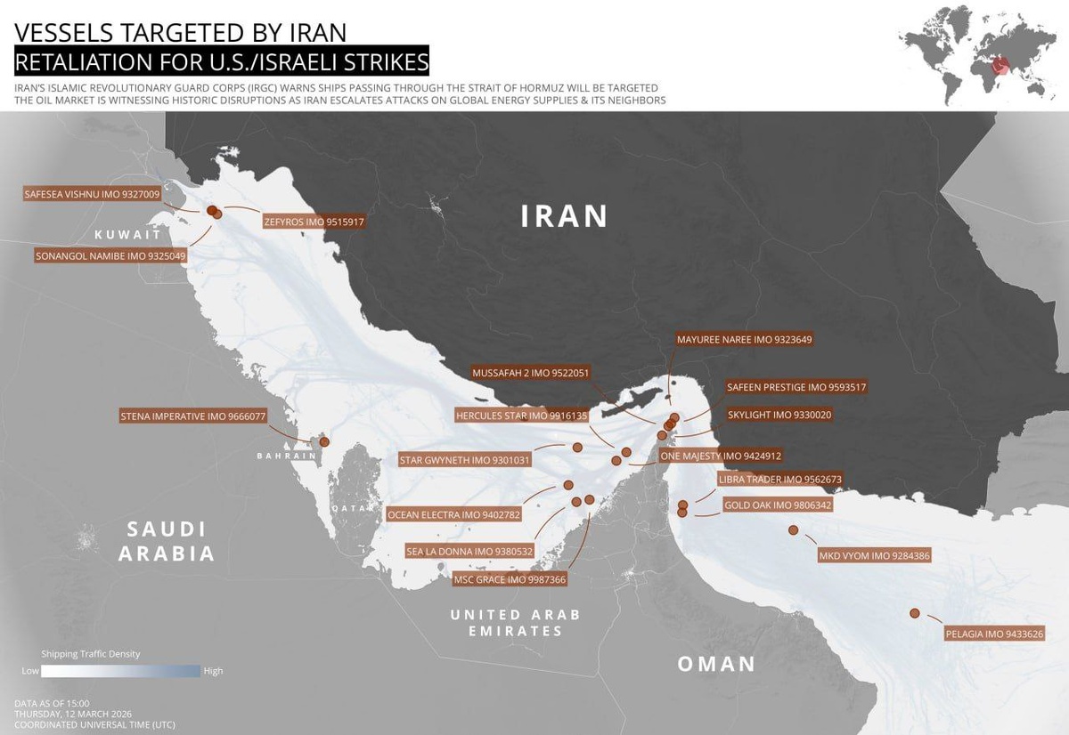 Примерная география иранских атак на торговые суда в Персидском заливе после перекрытия Ормузского пролива в ответ на нападение США и Израиля. В общей сложности были поражены по меньшей мере 18 торговых судов. 👆👆👆 🇮🇷 Корпус стражей исламской революции Ирана объявил о нанесении удара по американскому нефтяному танкеру Safesea Vishnu в Ормузском проливе. Судно ходит под флагом Маршалловых Островов. В заявлении КСИР уточняется, что танкер, принадлежащий США, был поражён в северной части пролива после того, как проигнорировал неоднократные предупреждения. Иранские военные также подчеркнули, что судоходство в Персидском заливе и Ормузском проливе подвергается возрастающему риску, и возложили ответственность за это на Соединённые Штаты. Тегеран призвал коммерческие суда соблюдать установленные им морские правила, чтобы избежать попадания под ракетные удары. На фоне продолжающихся ответных действий Ирана в ответ на совместные атаки США и Израиля КСИР ранее объявил о закрытии Ормузско